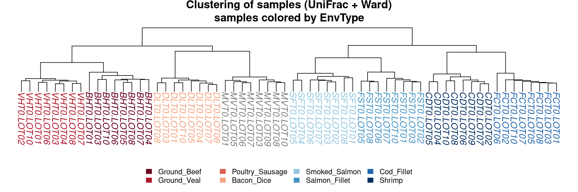 title = "Clustering of samples (UniFrac + Ward)\nsamples colored by EnvType")