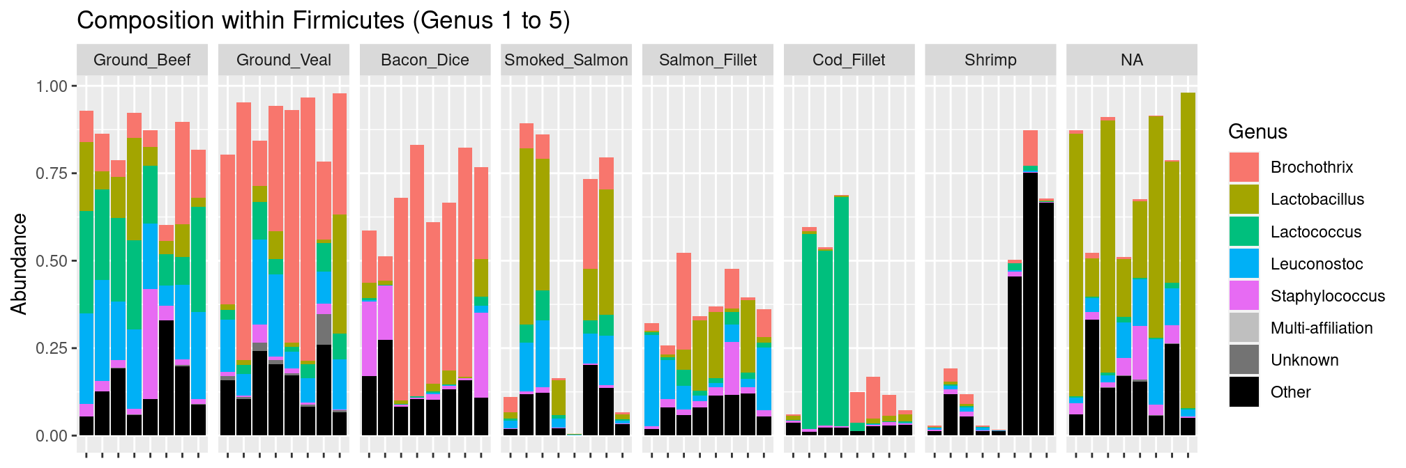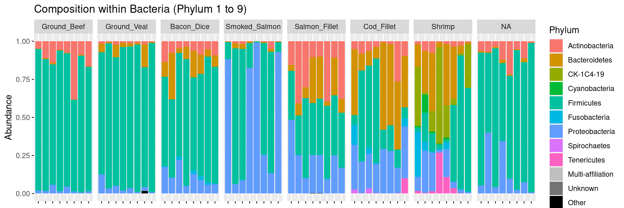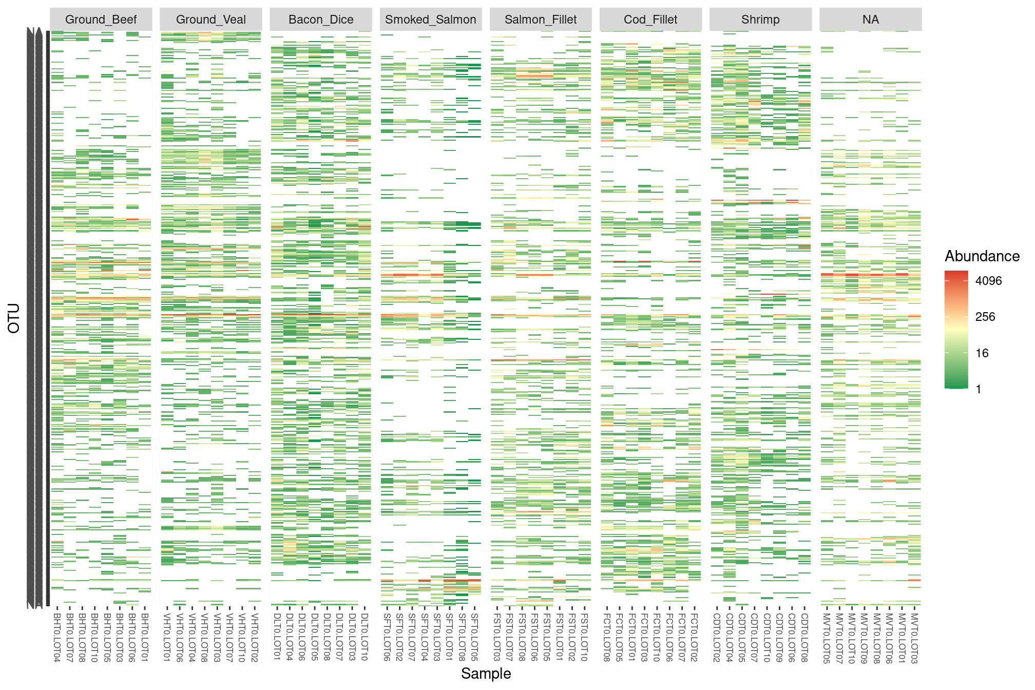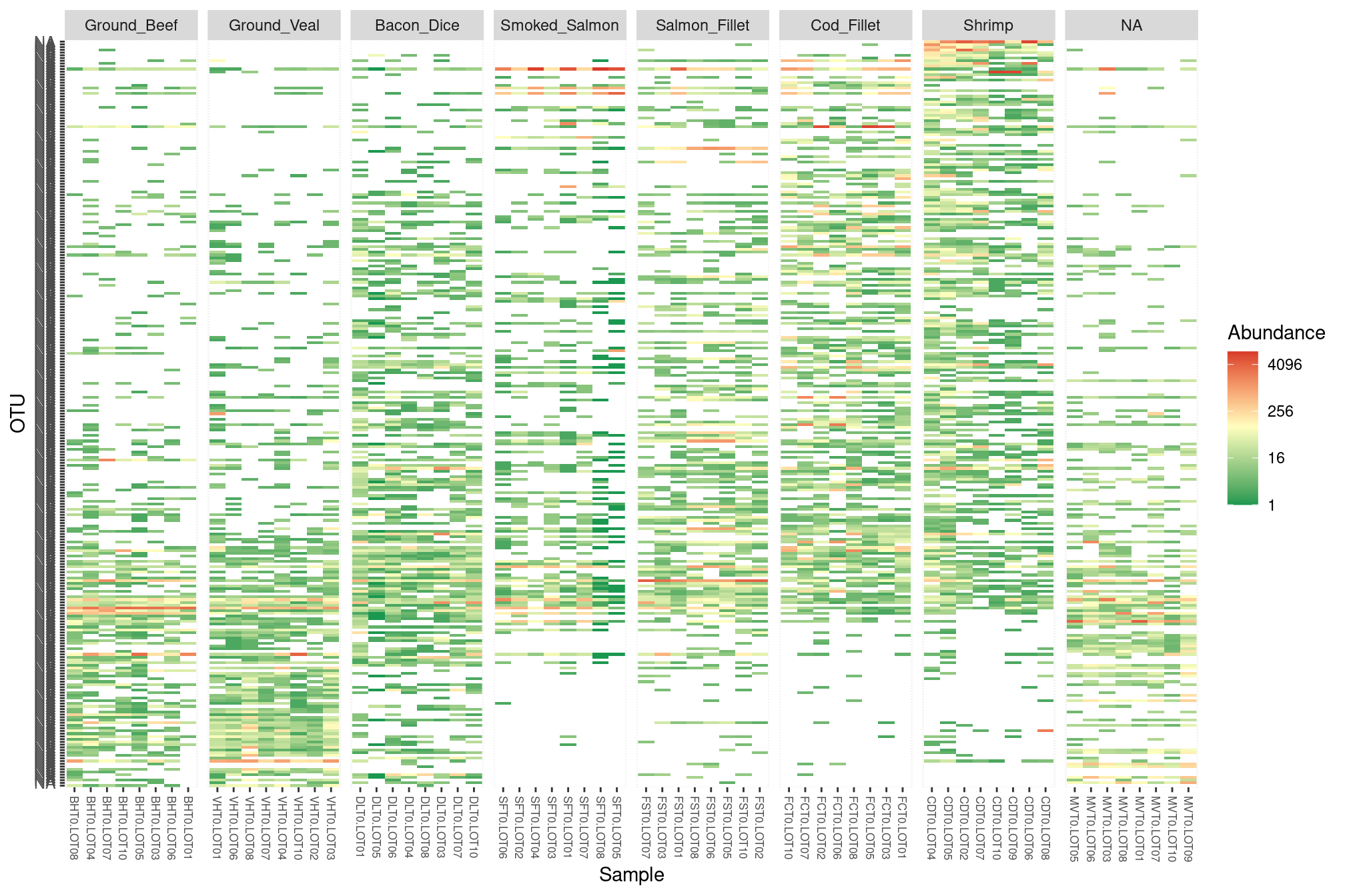 It looks like: - there is some kind of block structure in the data (eg. OTUs that are abundant in seafoods but not meat products or vice-versa) - dices of bacon have a lot of OTU in common with seafoods. This is indeed the case and the result of “contamination”, sea salt is usually added to bacon to add flavor. But, in addition to flavor, the grains of salt also bring sea-specific bacterial taxa (at least their genetic material) with them.