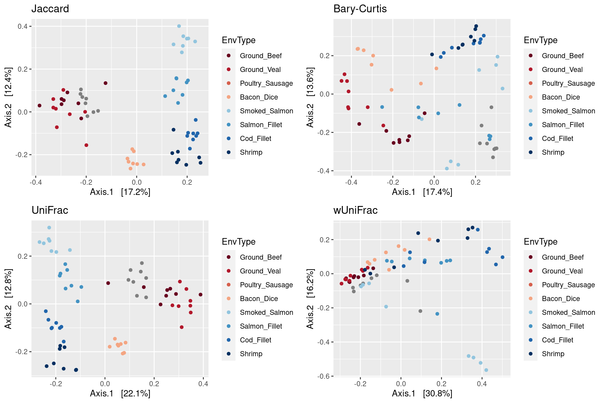 In this example, Jaccard and UniFrac distances provide a clear separation of meats and seafoods, unlike Bray-Curtis and wUniFrac. This means that food ecosystems share their abundant taxa but not the rare ones.